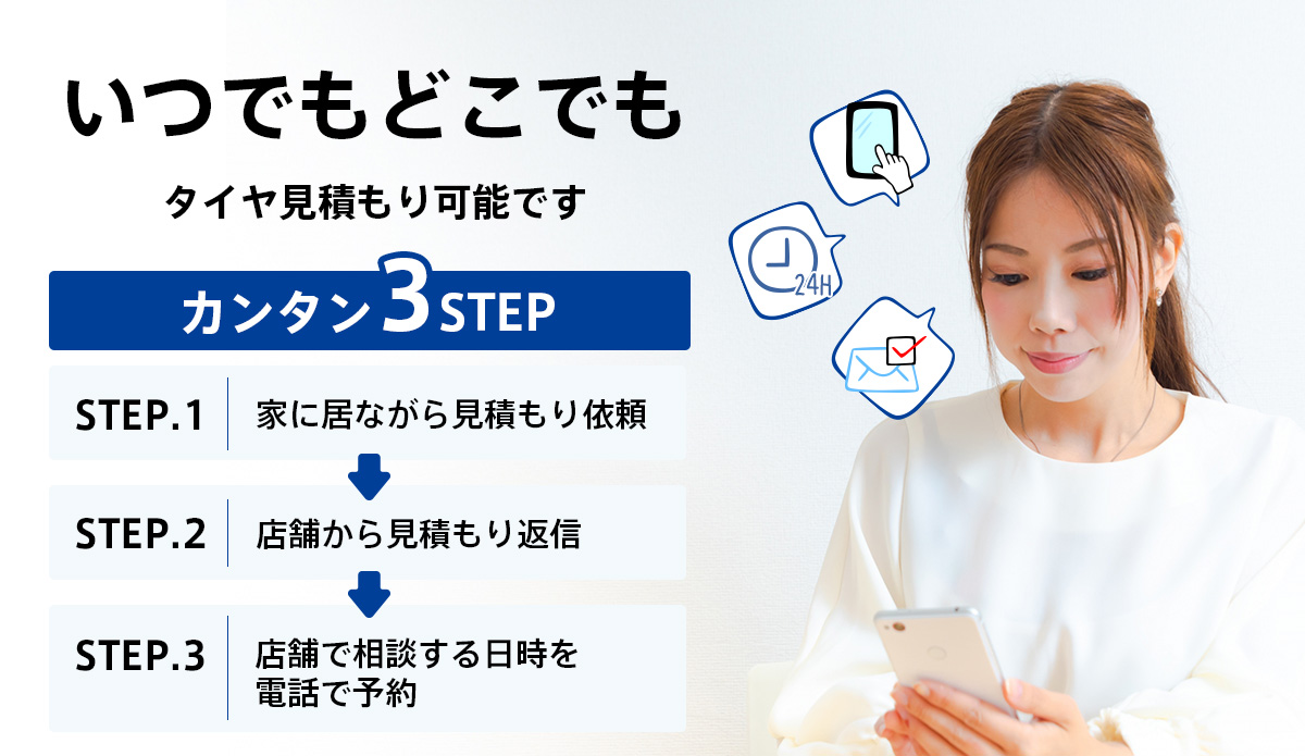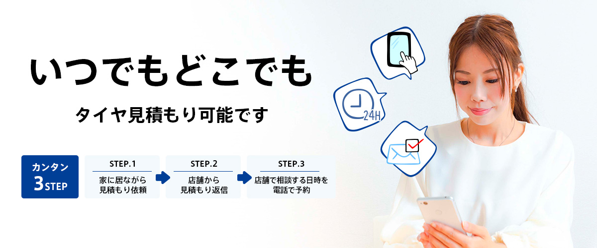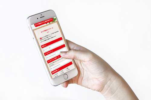 スマホ・ PCで下記見積もりフォームから気になったタイヤの見積もりを24時間365日依頼できます。